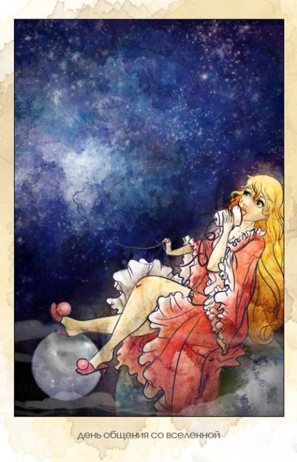 В День общения со вселенной надо обязательно вскарабкаться на Землю, закинуть ноги на Луну и, приложив к губам стаканчик связи со вселенной, рассказать далекой вселенной все про свои удачи и неудачи, про все свои победы и поражения, про то, что в небе над головой все в больших кучевых драконах и в маленьких перистых дракончиках, и что тени от них на земле играют в прятки и передают привет далекой вселенной, которая сейчас на связи.
