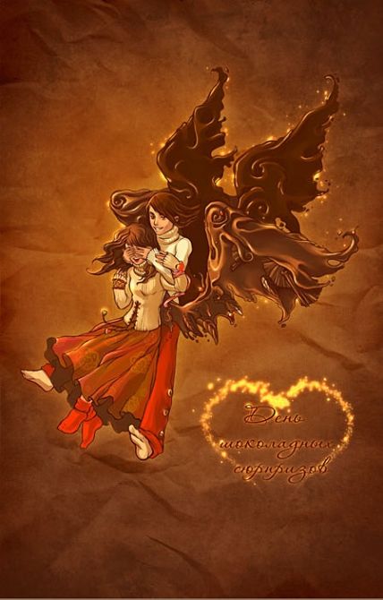 Нежный, сладкий, тягучий, волшебный День Шоколадных сюрпризов! Это - возвращение в детство с его таинственными подарками. Это - обмазанные первым шоколадом пальчики Это - дань традициям, когда: "А что у вас там, кофе? Тогда, с меня - шоколад! " И просто - воплощение наслаждения А ещё пожелание "пускай все у вас будет - в шоколаде". В этот день можно обмениваться шоколадными посланиями с самыми близкими и любимыми, а можно и просто незнакомцу, или незнакомке сказать "Здравствуй!", или пригласить на ~~чай~~ камру своего шоколадного ангела... :О))
