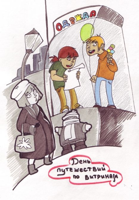 Витрины – это же незнакомые государства, континенты и мирки, как «город в табакерке», живущие своей жизнью и по своим законам! Вот площадь искусства, на которой вольготно расположились духовые и струнные инструменты, которые тихонько сочиняют мелодии будних дней! А вот – государство мехов, прильнувшее к окошку витрины изнутри, в надежде отыскать себе ласковых и добрых хозяев. Или – улица сверкающих солнечных бликов, щедро рассеянных в невероятном, загадочно-льдистом хрустале… Мы бежим каждый день мимо нагромождений шляпок и сумок, ковров и мебели, отмахиваясь от их зова, от их тоски по общению, не замечая притаившихся совсем рядом сказок, мимо, сквозь… Но если надеть волшебные очки, запастись бутербродами и фотоаппаратами, или пригласительными билетами и блокнотами, то можно такое увидеть! Вперед?!